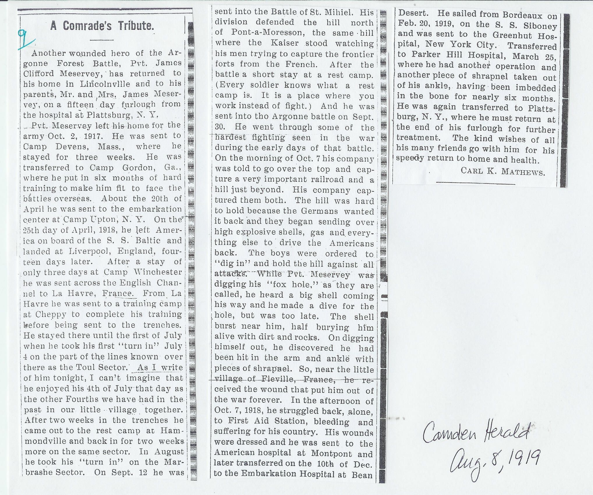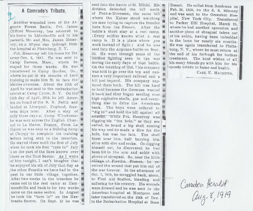 Carl Mathews, a WWI veteran himself, writes about James C. Meservey, home on furlough from a hospital in Plattsburg, NY, where he has been recuperating from wounds suffered in the Argonne battle, Oct. 7, 1918 in France.Relationships