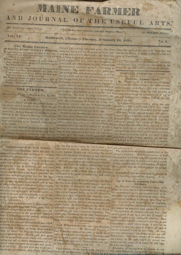 "The Maine Farmer is issued every Tuesday morning in a quarto form, making at the end of the year a volume of over 400 pages to which will be given a Title Page and Index."Update Date