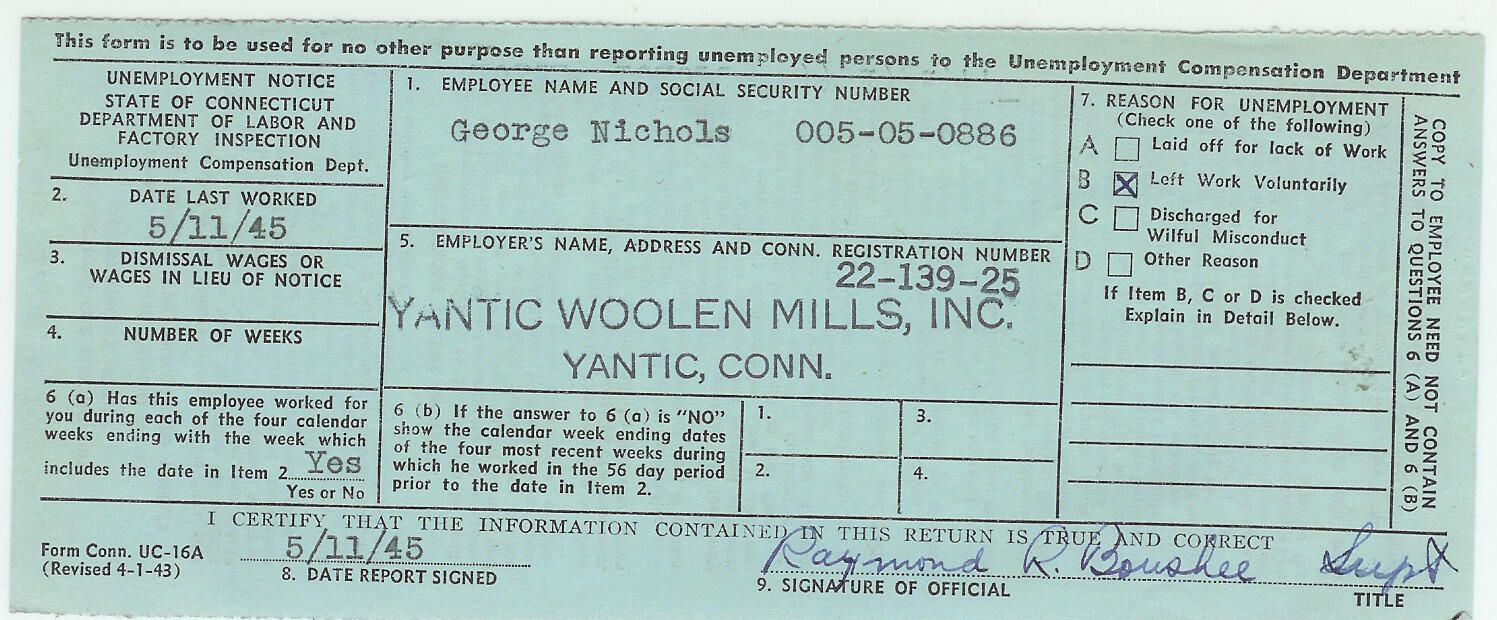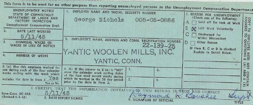 Unemployment Compensation Department Form issued by the state of Connecticut for George E. Nichols.