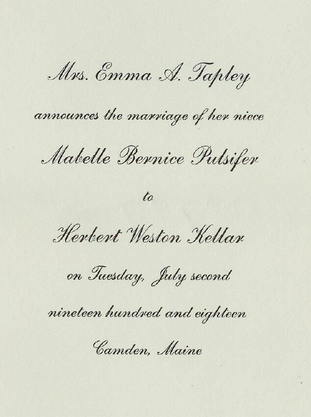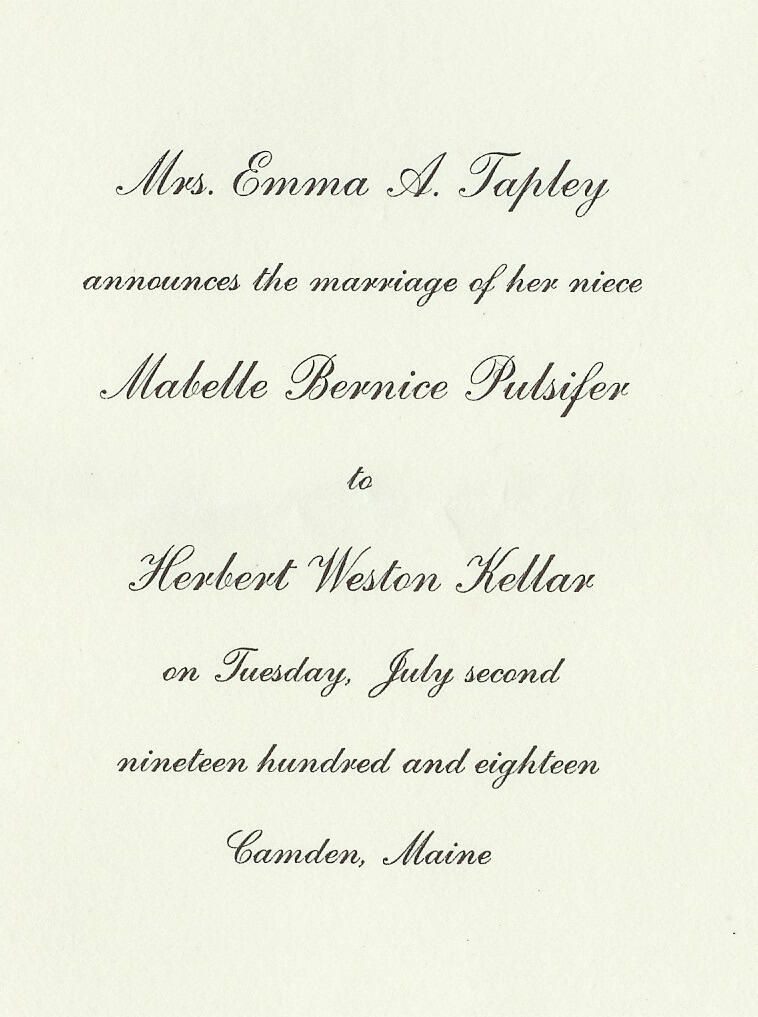 Wedding announcement for Mabelle Weston Pulsifer and Herbert Weston Kellar.