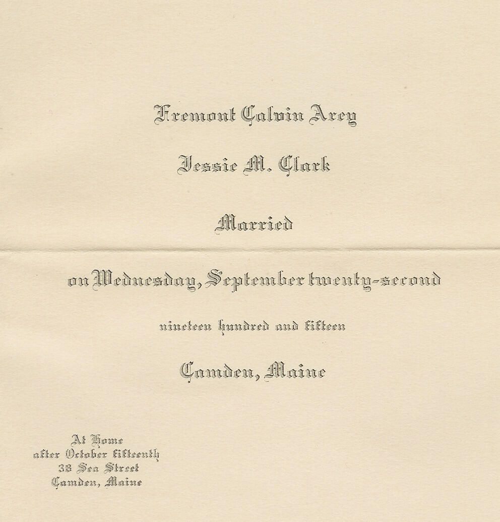 Wedding announcement of Calvin Arey and Bessie M. Clark.