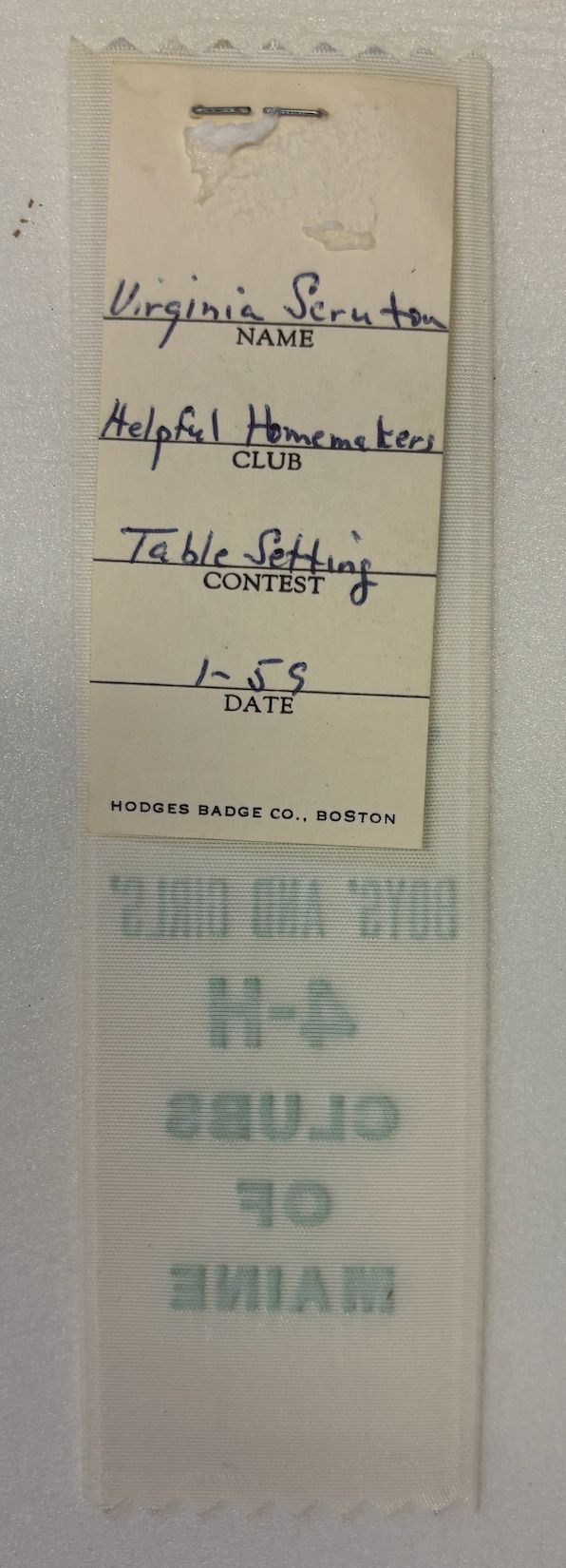 4-H Ribbon won by Virginia Scruton; Helpful Homemaker's Club; Contest: Table SettingRelationships