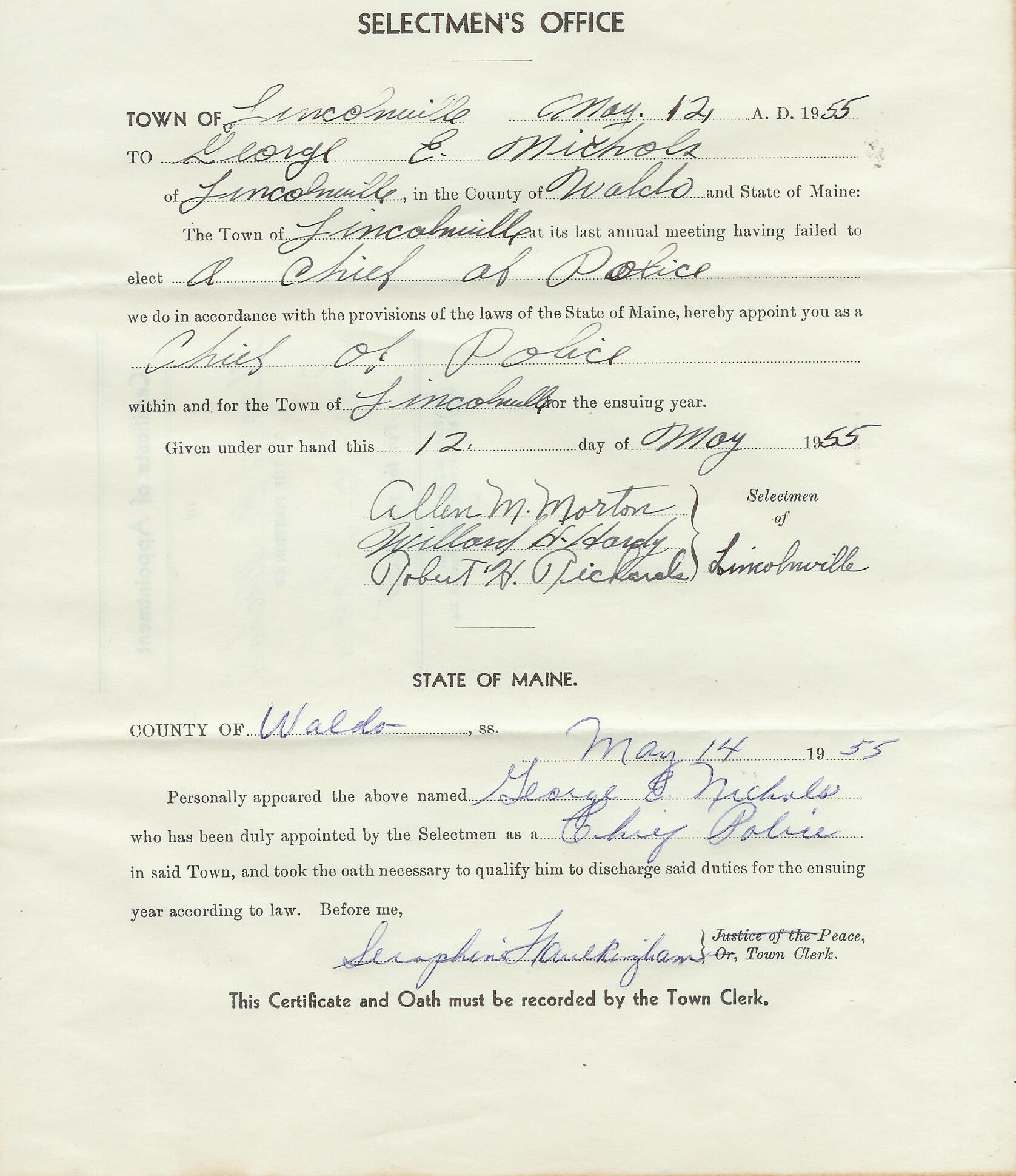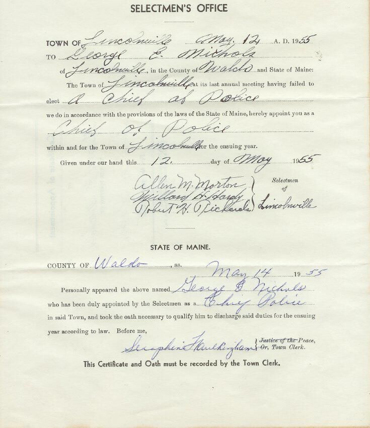Document from Lincolnville Selectmen appointing George E. Nichols to position of Chief of Police for the town of Lincolnville.