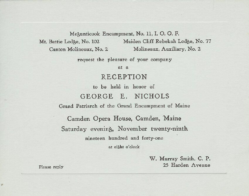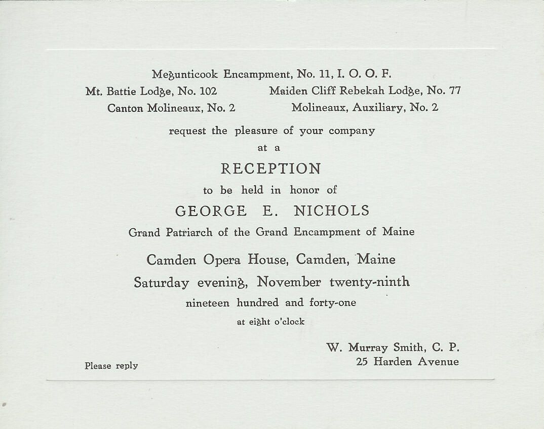 Invitation to a reception honoring George E. Nichols (Great Patriarch of the Grand Encampment of Maine) at the Camden Opera House, Camden, Maine.Update Date