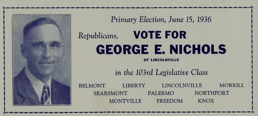 Political handbill "Vote for George E. Nichols" for Maine State Legislature. Photograph on handbill.