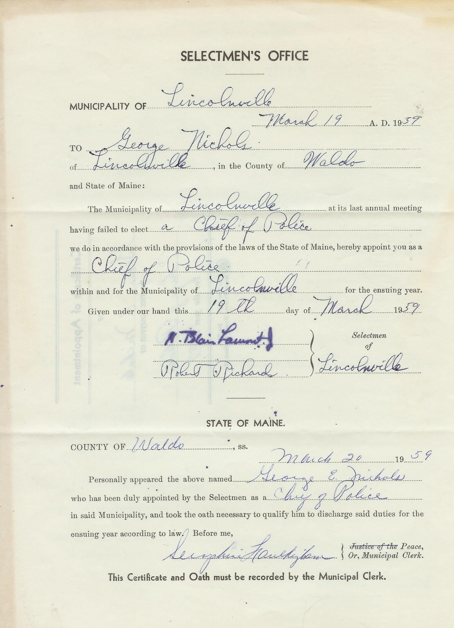 Document from Lincolnville Select Board appointing George E. Nichols to the position of Chief of Police.