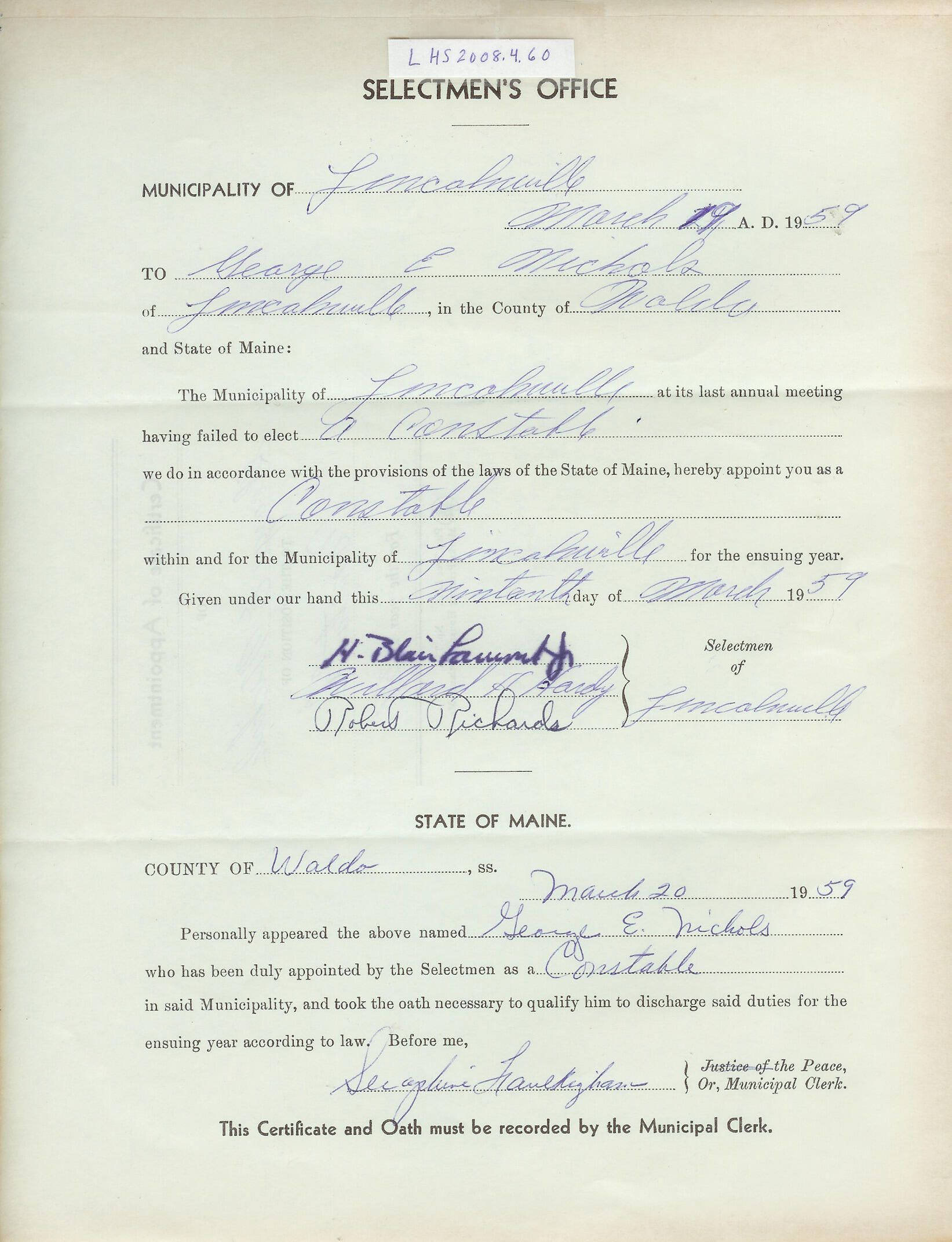 Document from Lincolnville Board of Selectmen appointing George E. Nichols to the position of Constable.