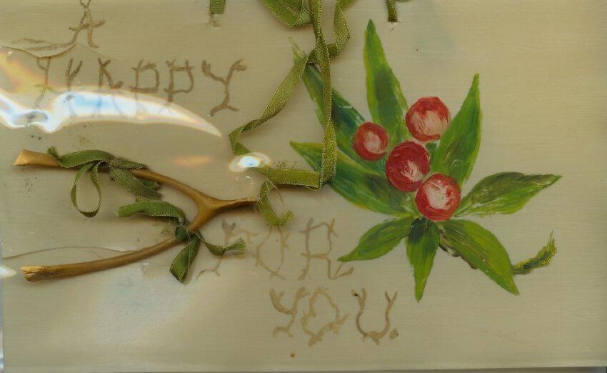 Handmade greeting card with green ribbon and chicken wishbone attached. Happy hunting, maybe?