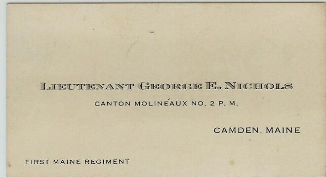 Lieutenant George E. Nichols membership card - First Maine Regiment, Canton Molineaux No. 2 P. M.