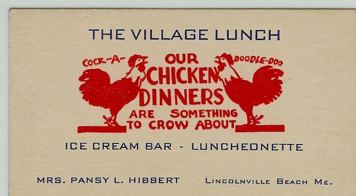 Card advertising "The Village Lunch", Lincolnville Beach, Maine. "Our chicken dinners are something to crow about".