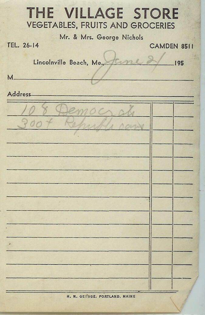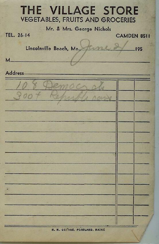 Blank receipt from the Village Store, Lincolnville Beach, Maine. "VEGETABLES, FRUITS AND GROCERIES".