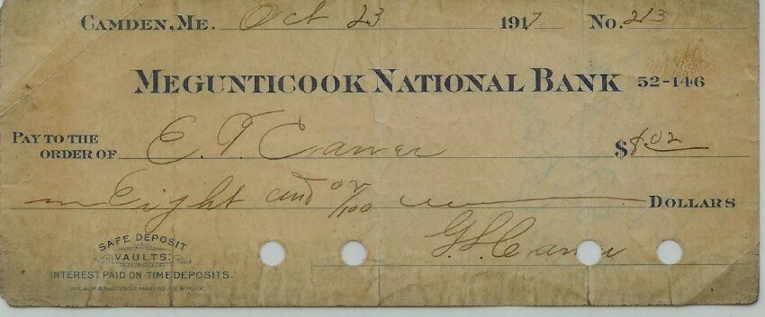 Check from Megunticook National Bank, Camden, Maine made out to E. T. Cramer in the amount of $8.02.