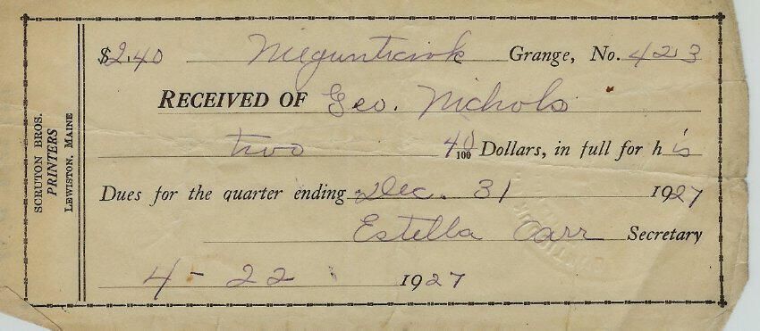 Receipt from Megunticook Grange to George E. Nichols for membership dues paid.