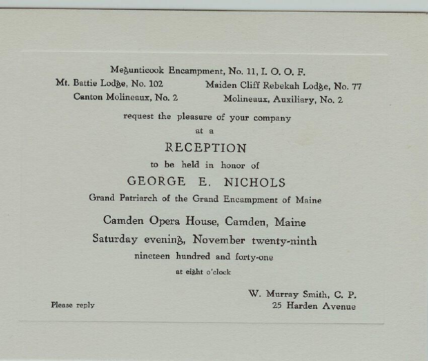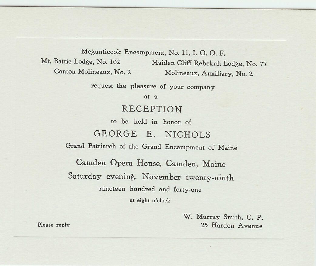 Invitation from Megunticook Encampment, #11, I.O.O.F. for a reception held for George E. Nichols, Grand Patriarch of the Grand Encampment of Maine.Relationships