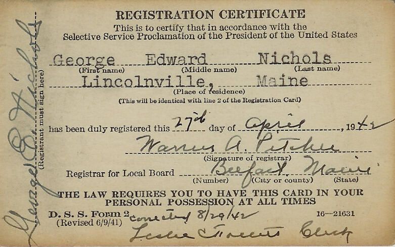 Draft Registration Certificate issued to George E. Nichols by Registrar Warren A. Pitcher.