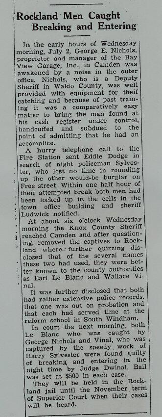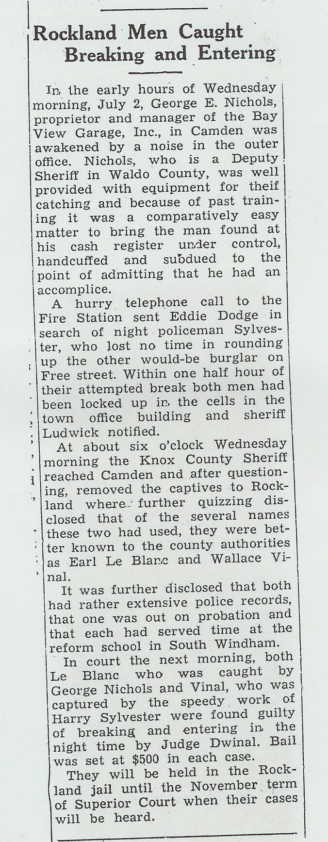 Newspaper clipping with details of a break in at Bay View Garage in Camden, Maine owned by George E. Nichols.Relationships