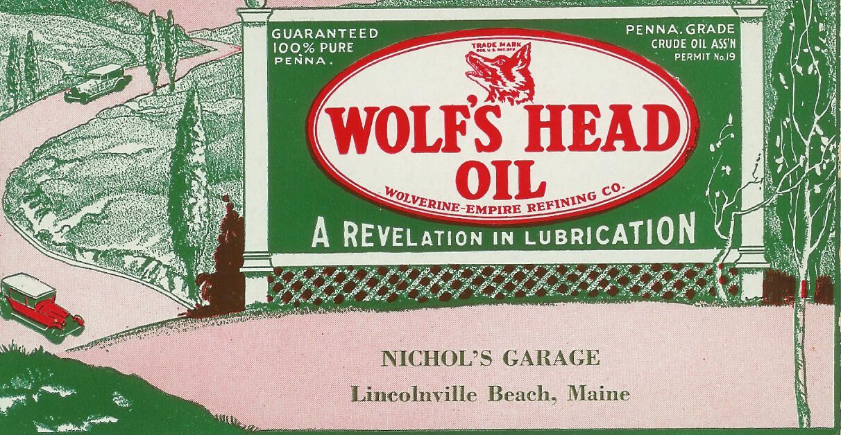 Blotter from Nichol's Garage in Lincolnville Beach, Maine advertising Wolf's Head Oil.