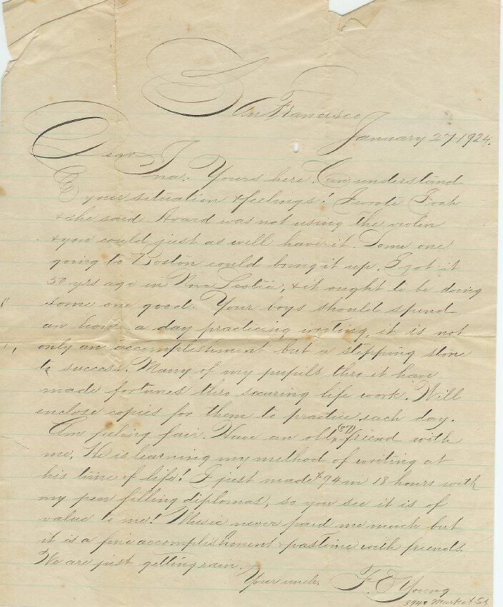 handwritten letter from F.O. Young to his grandniece, Ina Hardy Rolerson, from his home in San FranciscoRelationships