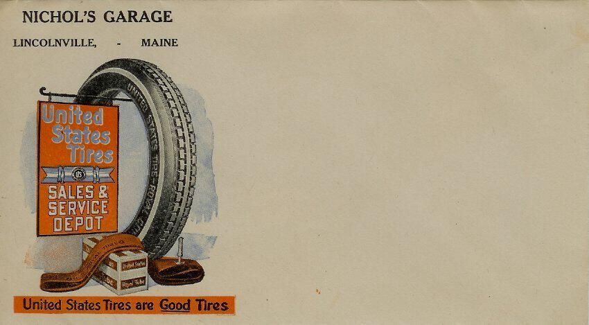 Unused envelope from Nichol's Garage, Lincolnville, Maine. Ad on front of envelope reads: United States Tires, Sales and Service Depot. United States Tires are good tires.Update Date