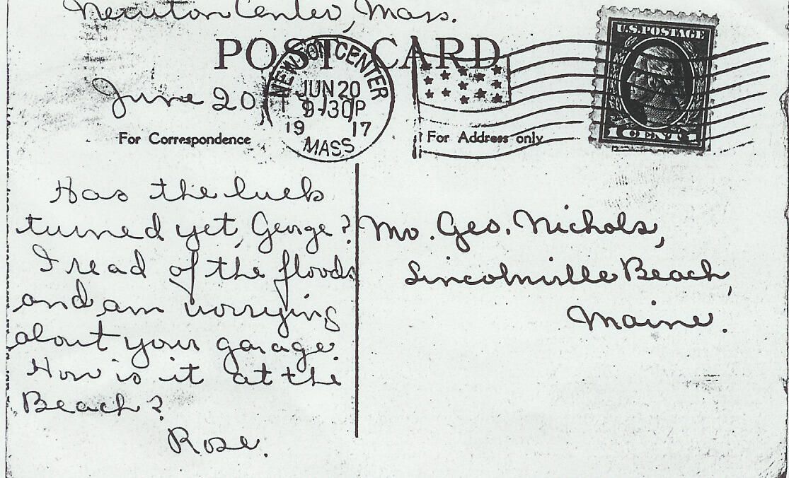 Copy of postcard from Rose Pillsbury to George Nichols inquiring about his garage (whether it had been damaged by a recent flood).Relationships