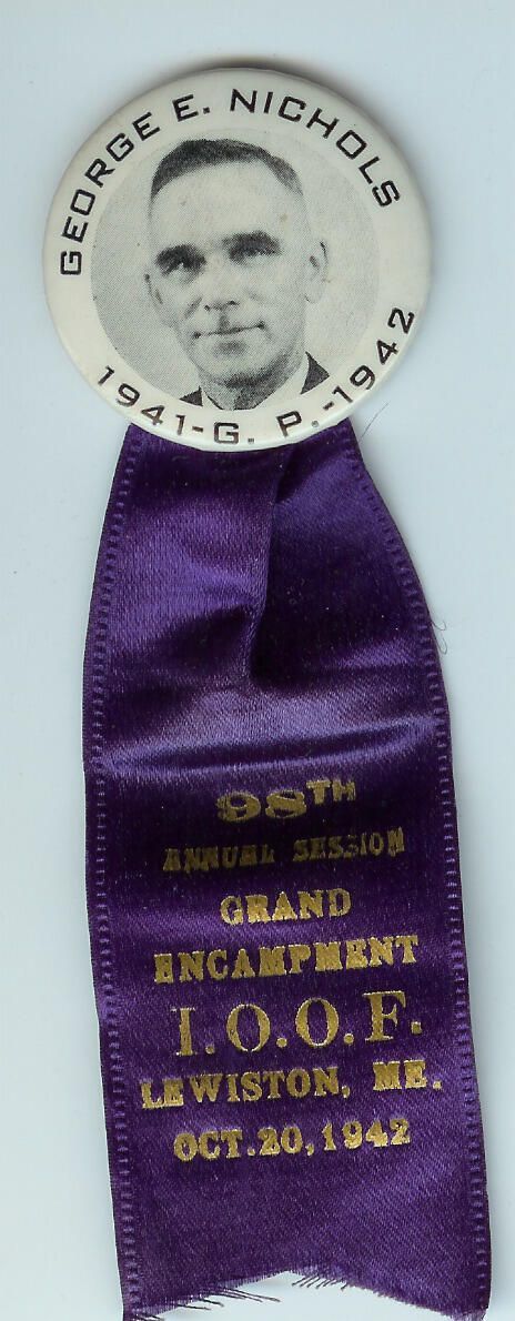 Identification tag worn by George E. Nichols at 98th annual session of the I.O.O.F. in Lewiston, Maine.