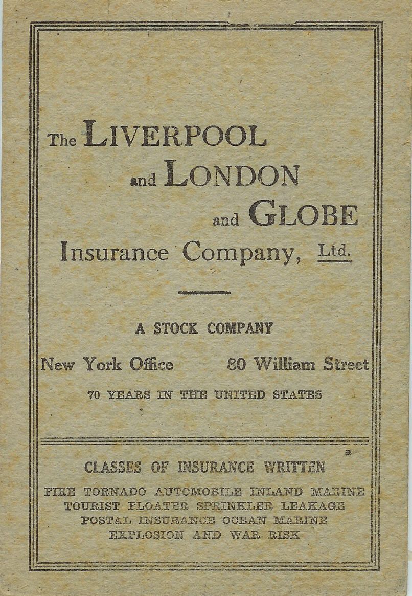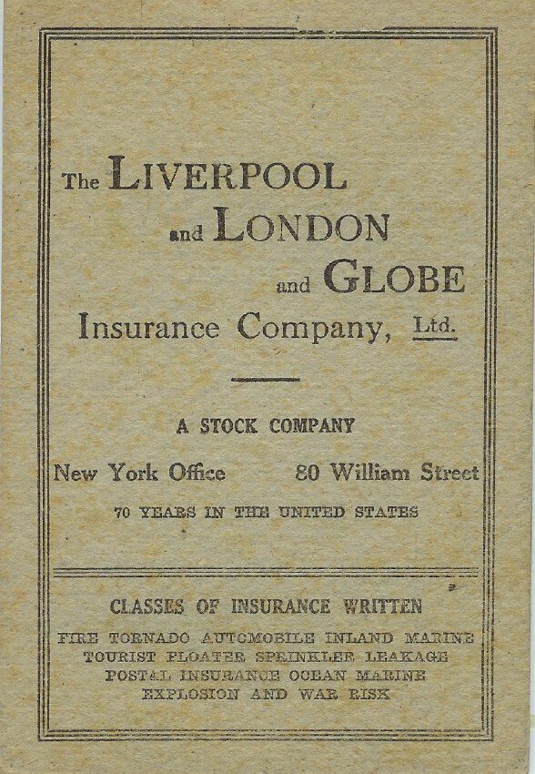 Note pad kept by George E. Nichols with letterhead advertising "The Liverpool and London and Globe Insurance Company. Motto on letterhead: Has transacted business in the United
