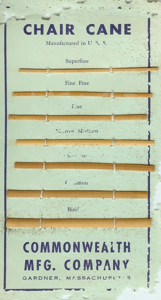 Advertisement from Commonwealth Manufacturing Company in Gardner, Massachusetts showing samples of chair cane on card.