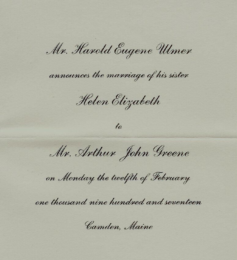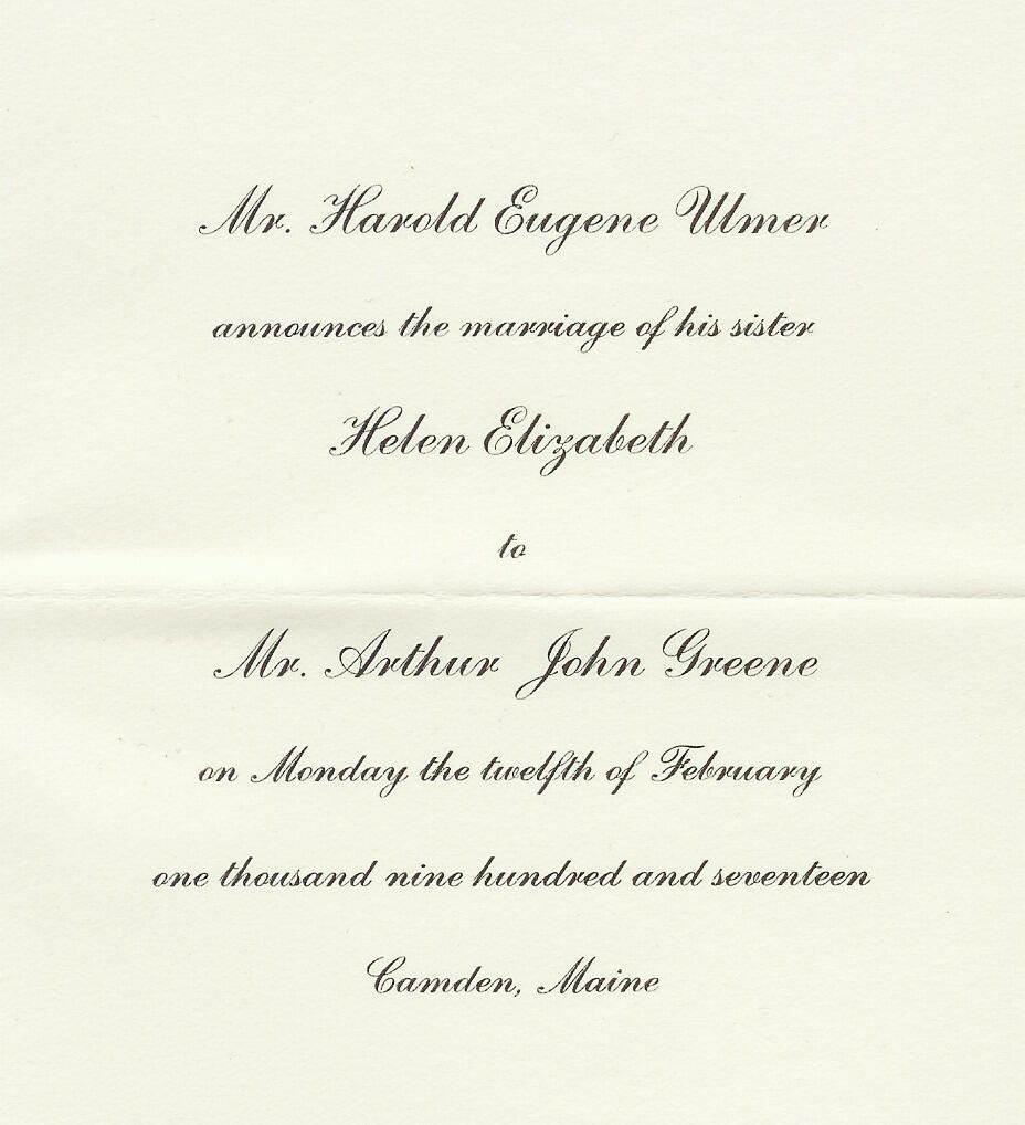 Wedding announcement of Helen Elizabeth and Arthur John Greene