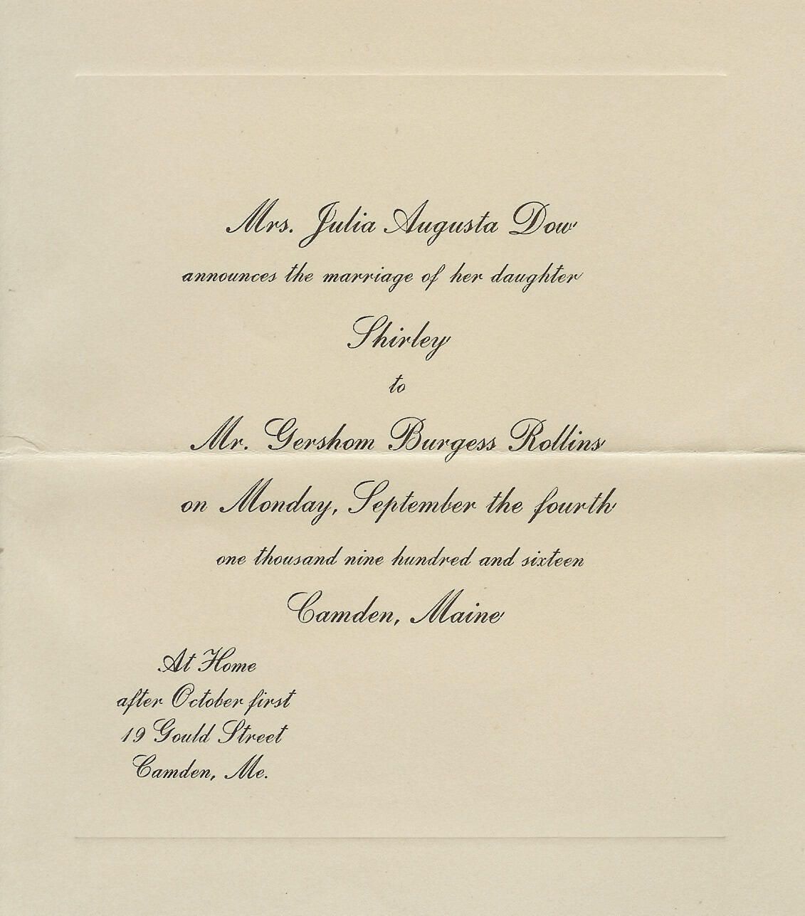 Wedding invitation announcing the marriage of Shirley Dow daughter of Mrs. Julia Augusta Dow to Gershom Burgess Rollins. Their home after marriage was at 19 Gould Street, Camden, Maine.Update Date