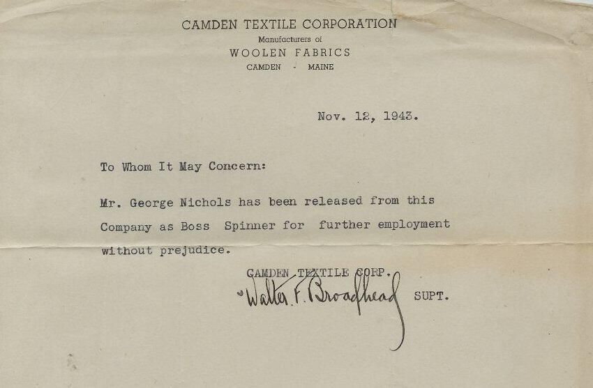 Camden Textile Company release for George E. Nichols from employment as Boss Spinner.Relationships