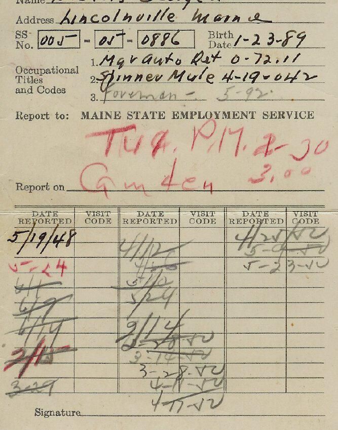 Identification card issued to George E. Nichols by the Maine State Employment Service.