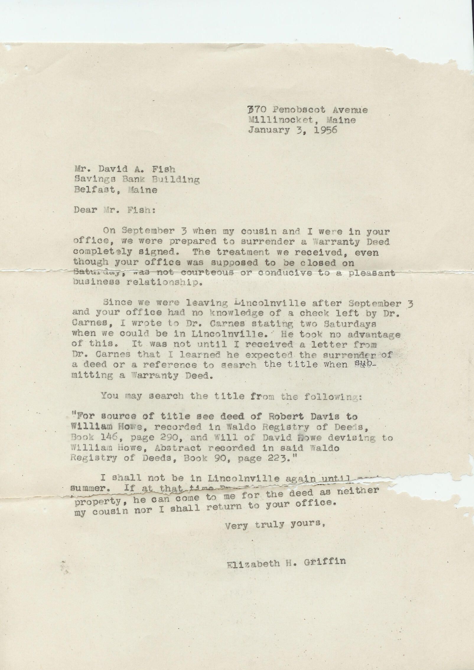 Correspondence from Elizabeth Griffin to David Fish expressing displeasure with Mr. Fish's office staff regarding surrender of a warranty property deed.