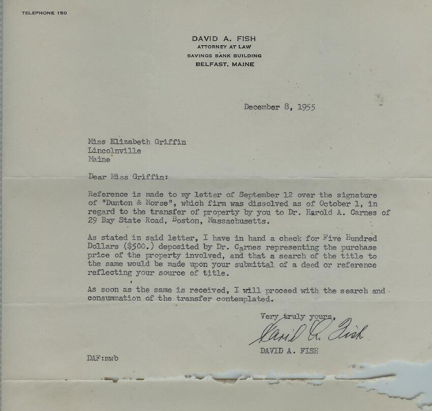 Correspondence from David A. Fish attorney to Elizabeth Griffin regarding transfer of property from Elizabeth to Dr. Harold Carnes for the price of $500.00.Update Date