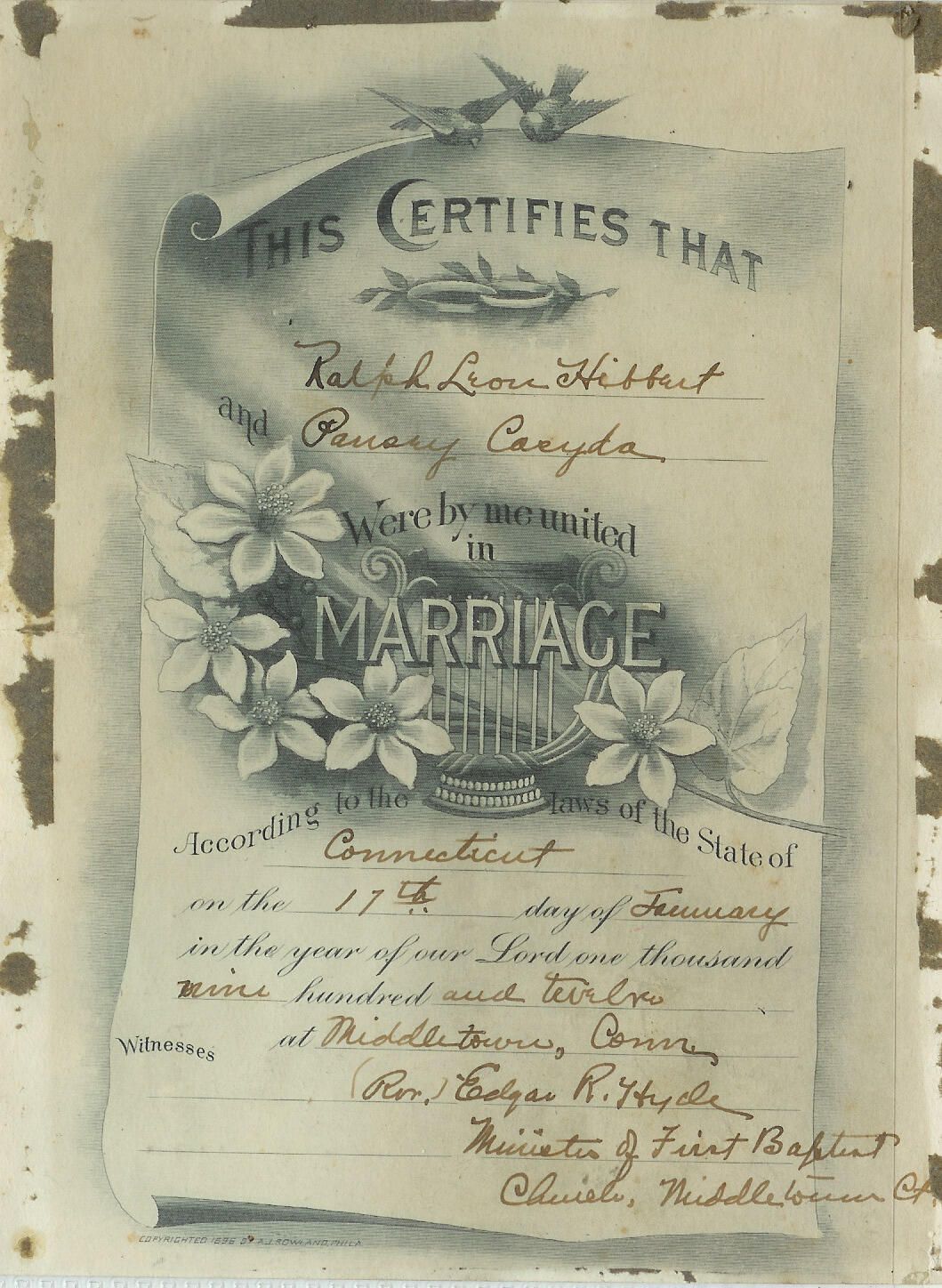 Marriage certificate issued to Pansy Casyda and Ralph Leon Hibbert.