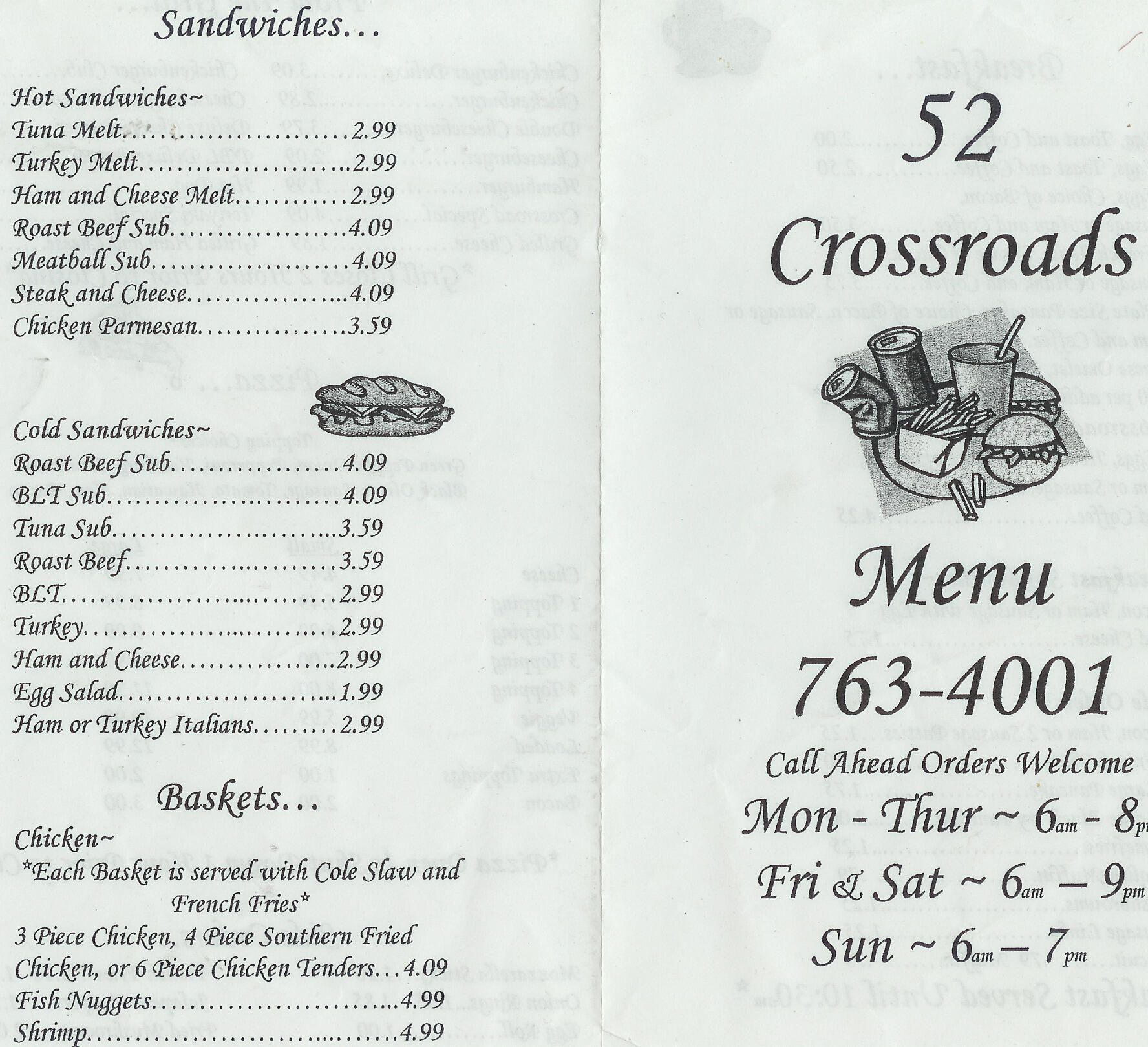 menu of Route 52 Crossroads, located at corner of Beach and Camden Roads in Lincolnville Center