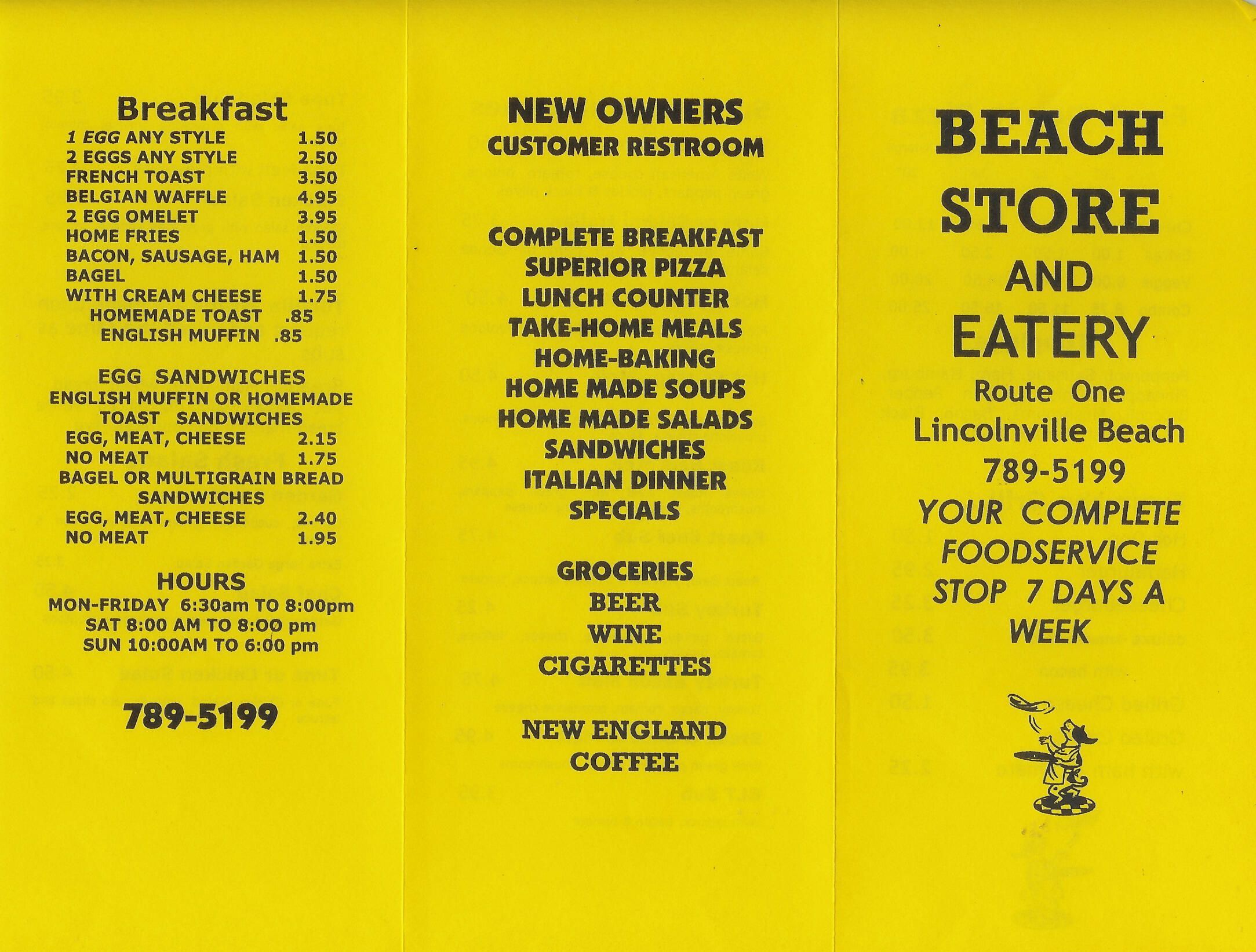 one page menu from Beach Store