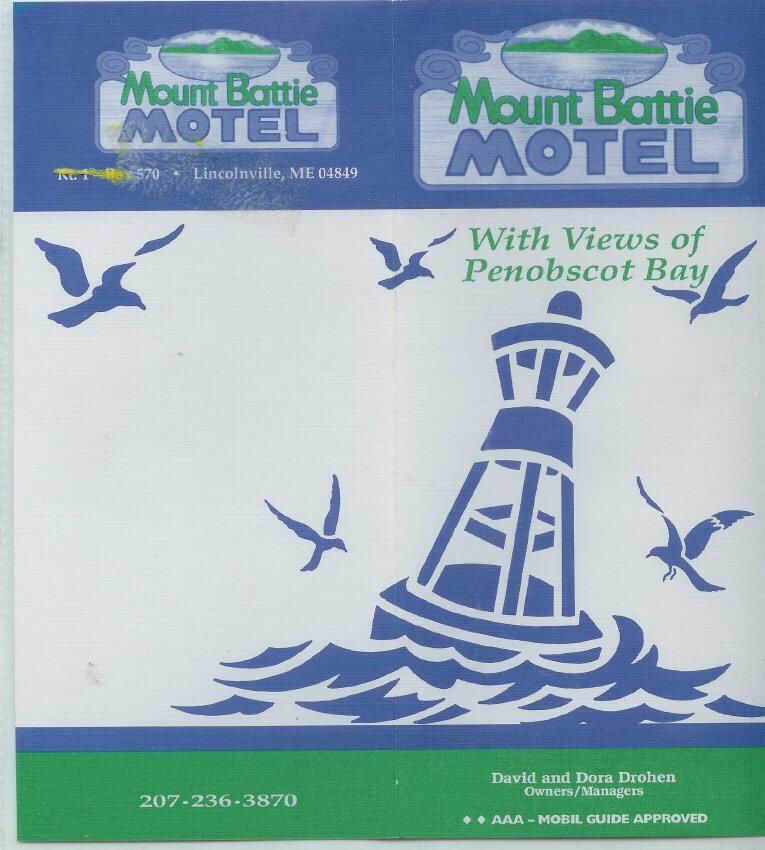 two-sided bi-fold two color (green and blue) brochure for Mount Battie MotelRelationships