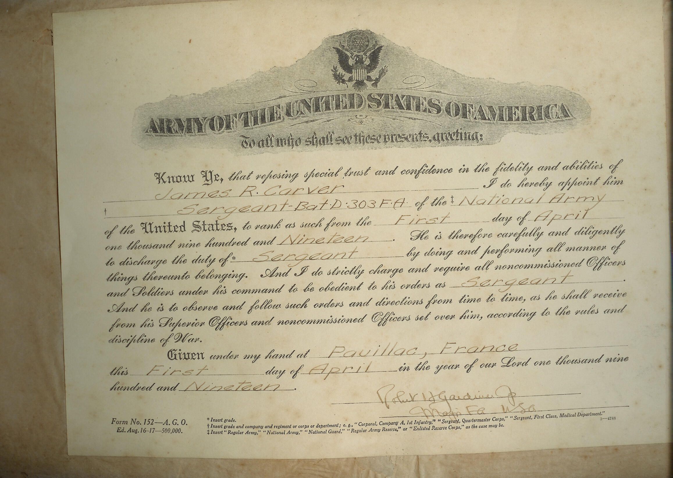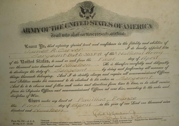 Certificate of promotion to the office of sargeant awarded to James R. Carver by the United States Army in Pauillac, France.