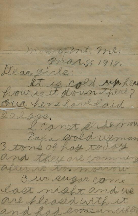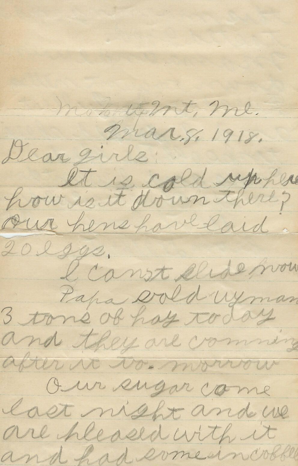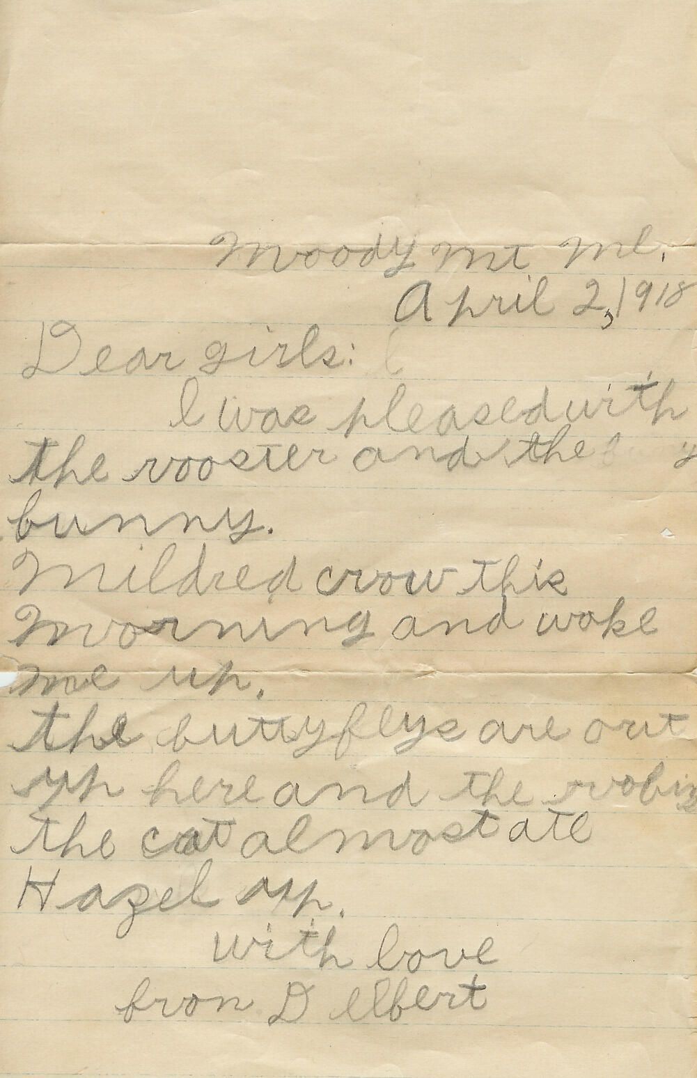 Personal letter written by Adelbert French of Moody Mountain to "Girls" when he was 17. Speaks of life on the farm.