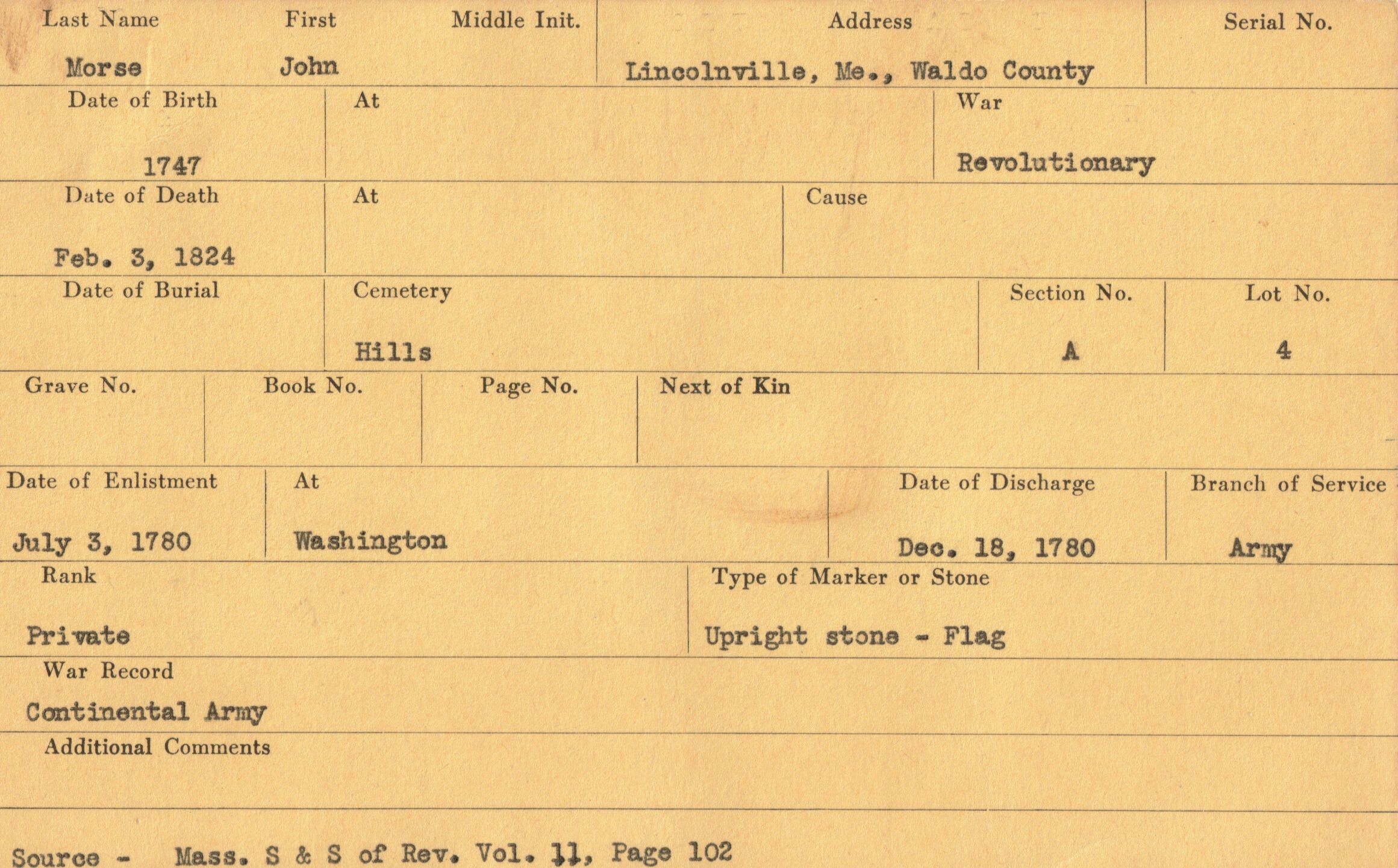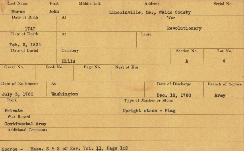 Military record of John Morse who served in the Revolutionary War.Relationships