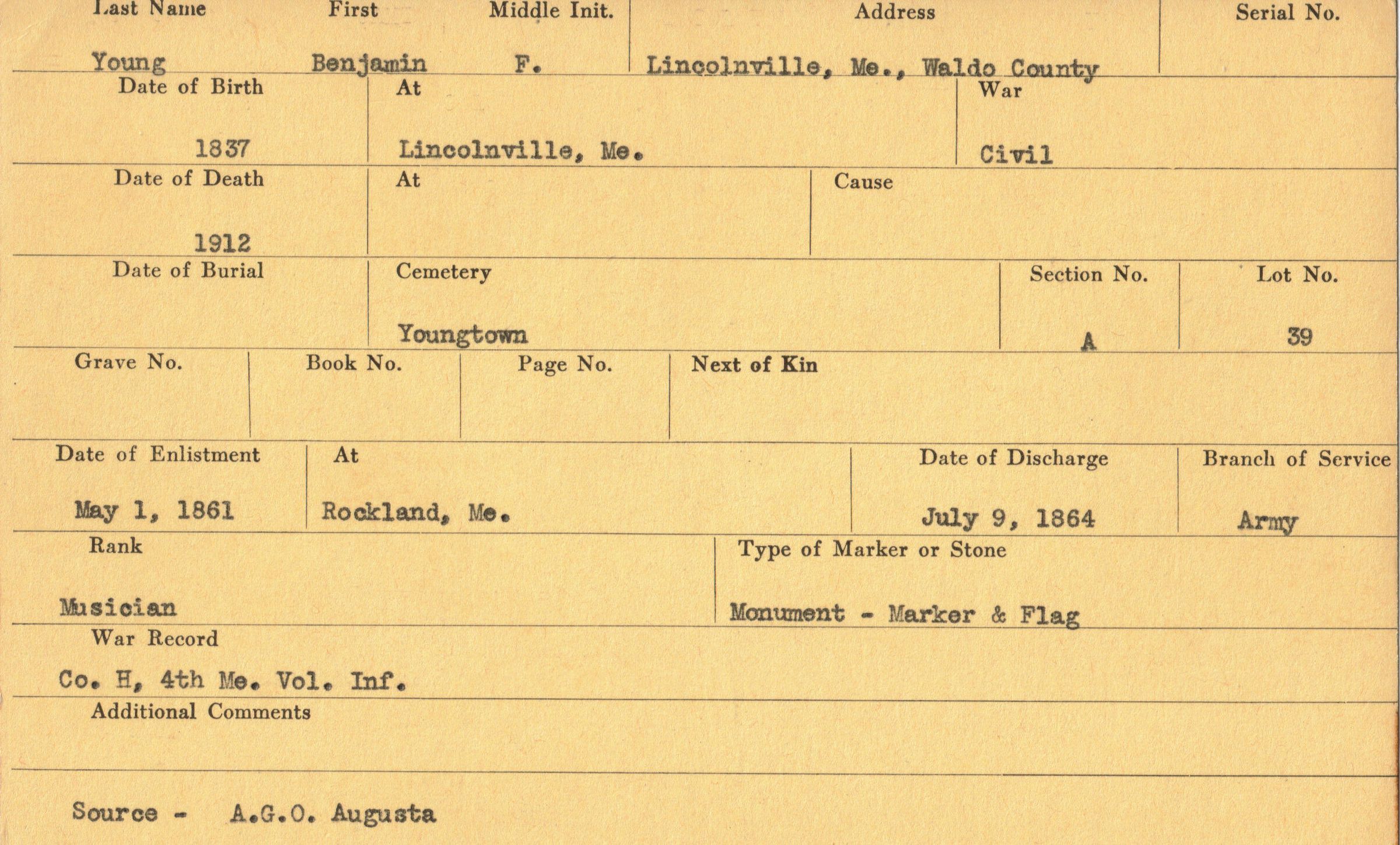 Military records of Benjamin F. Young who served in the Civil War.Relationships