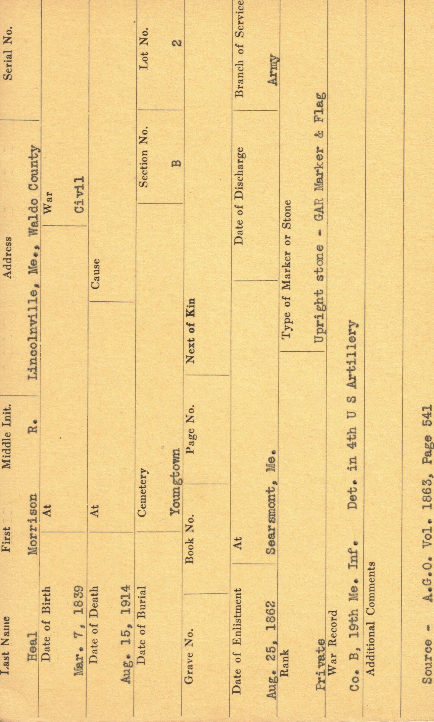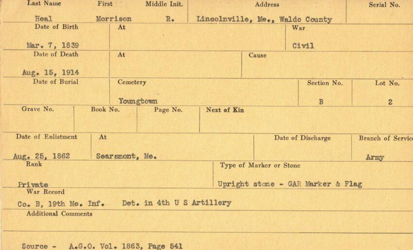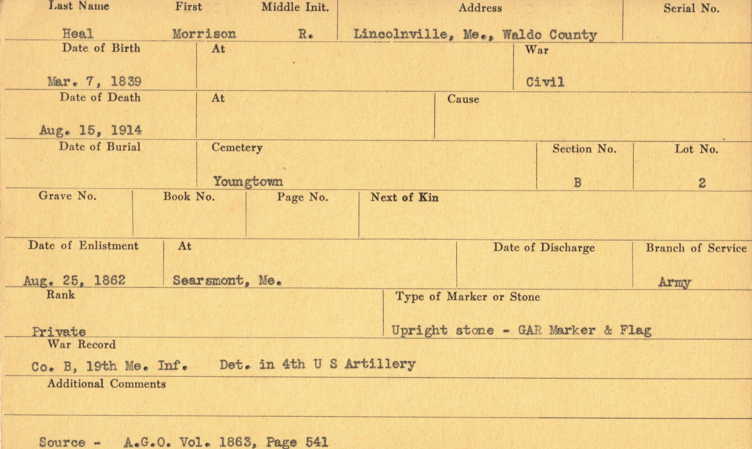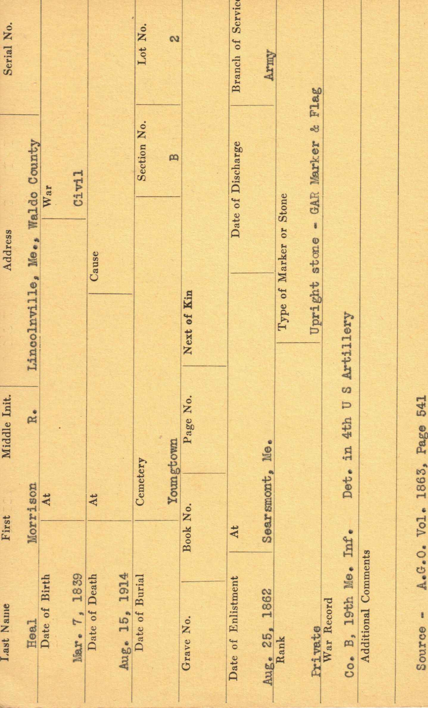 Military records of Morrison R. Heal who served in the Civil War.Relationships