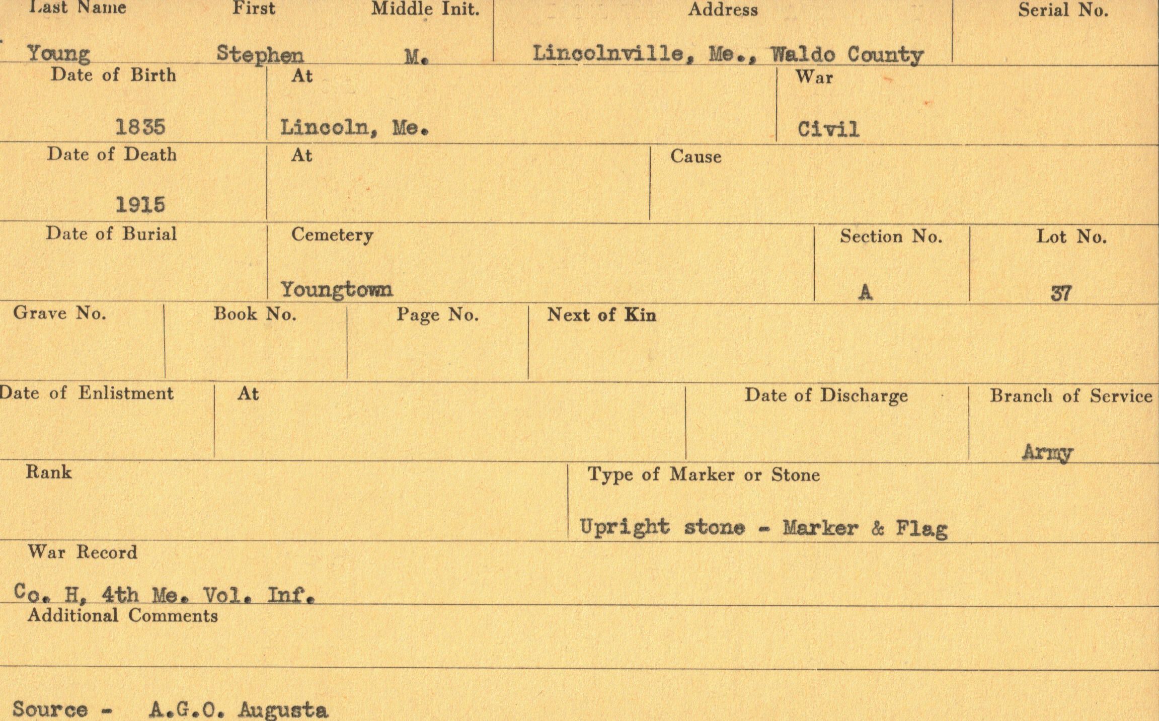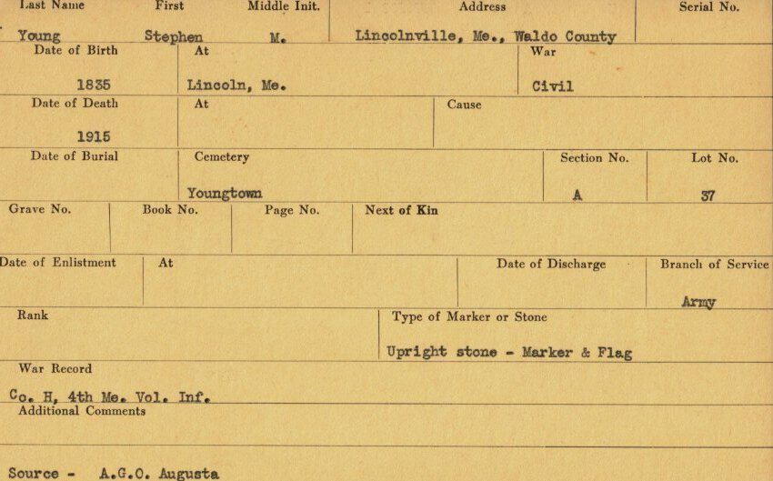 Military records of Stephen M. Young who served in the Civil War.Relationships