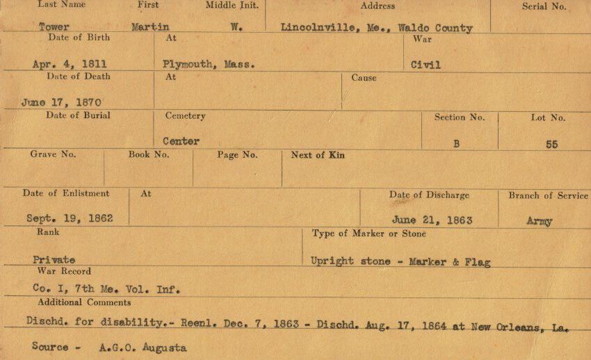Military records of Martin W. Tower who served in the Civil War.Relationships