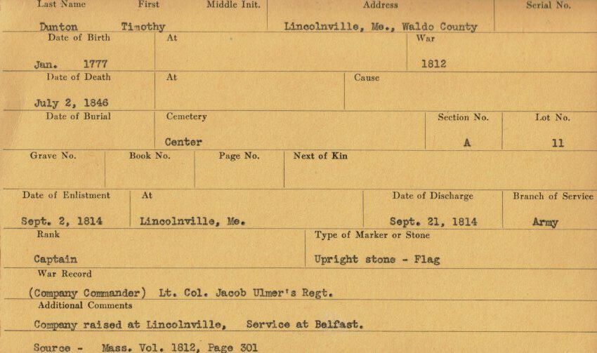 Military records of Timothy Dunton who served in the War of 1812.Relationships
