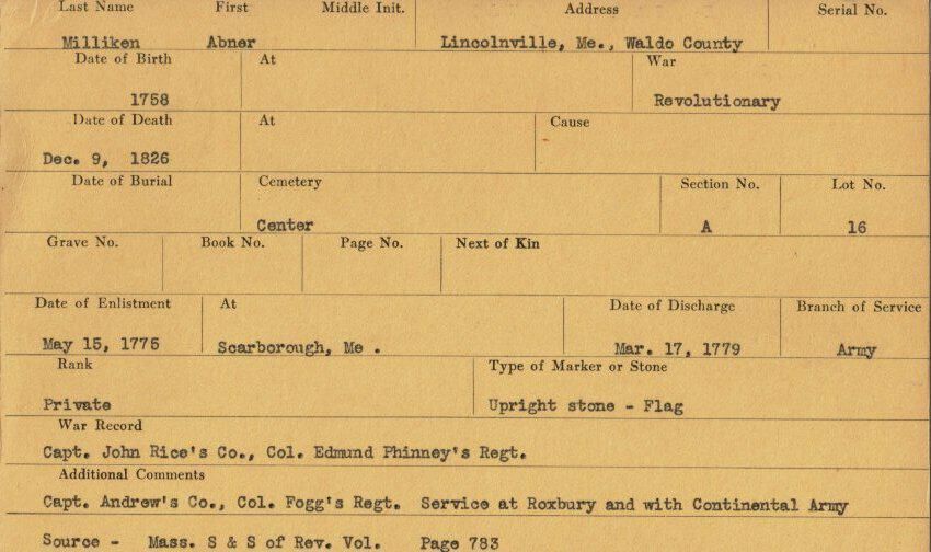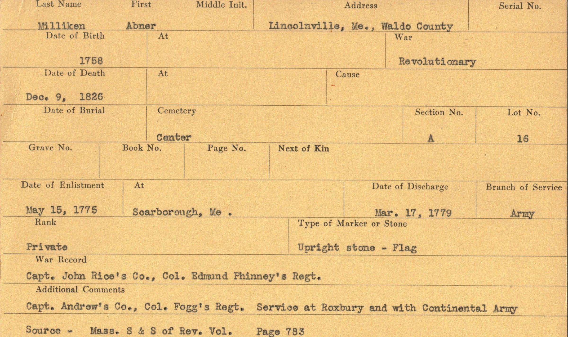 Military records of Abner Milliken who served in the Revolutionary War.Relationships