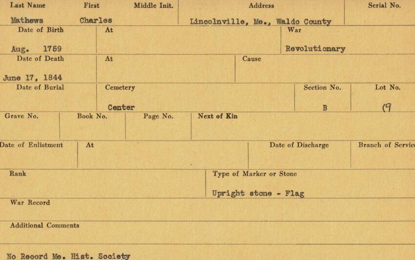 Military records of Charles Mathews who served in the Revolutionary War.Relationships