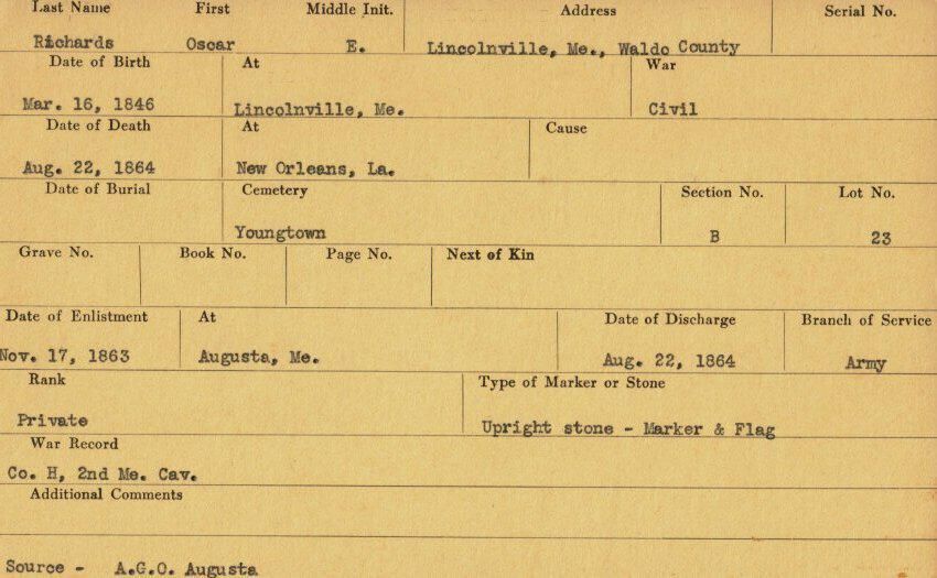 Military records of Oscar E. Richards who served in the Civil War.Relationships