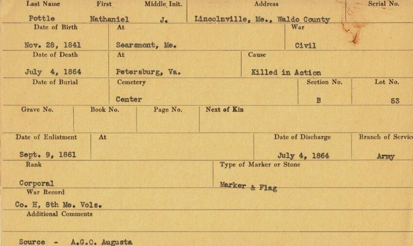 Military records of Nathaniel J. Pottle who served in the Civil War and was killed in action at Petersburg, Virginia.Relationships