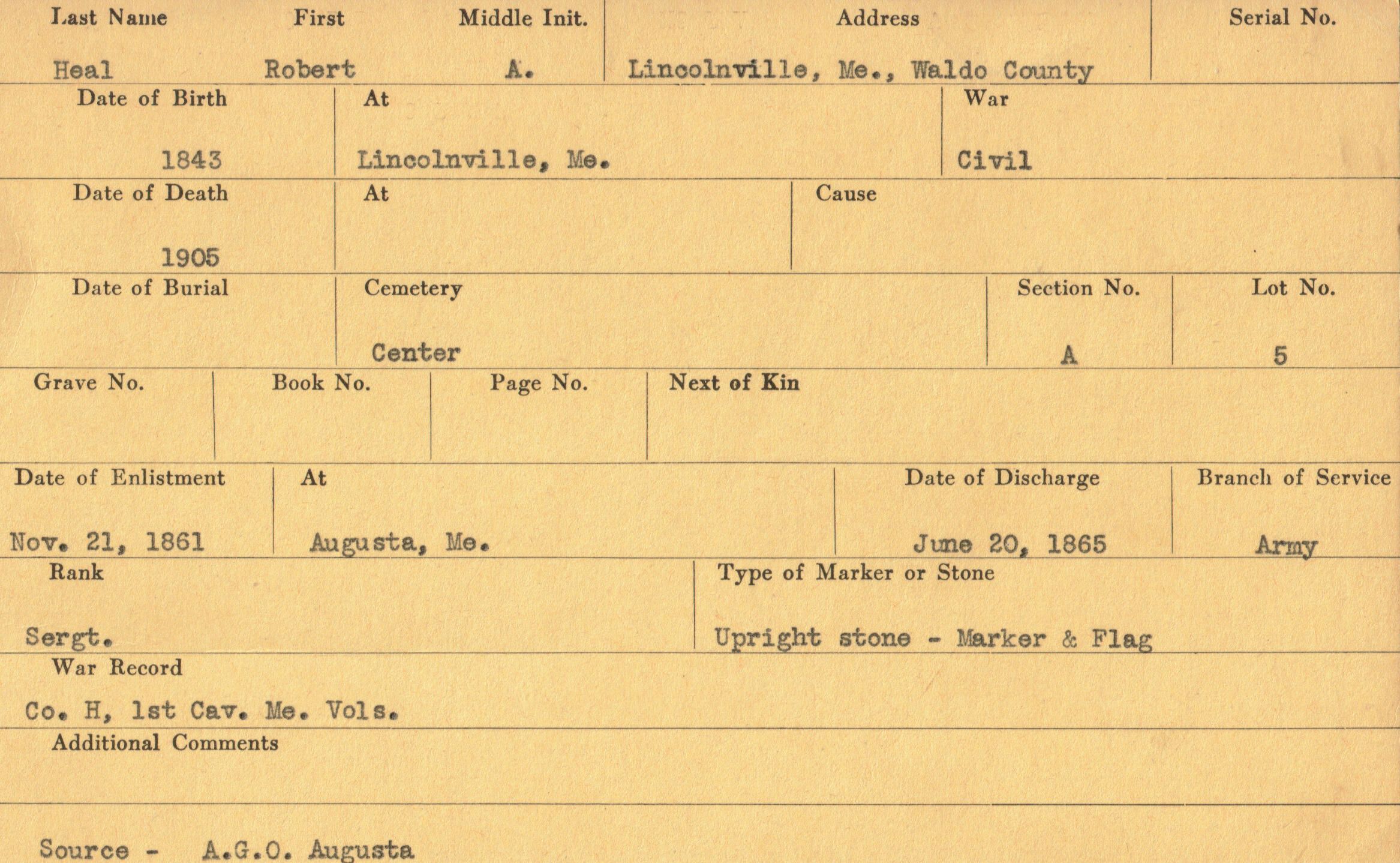 Military records of Robert A. Heal who served in the Civil War.Relationships